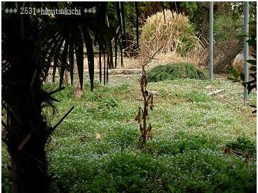 モーちゃんの右側は満開オオイヌノフグリの花畑。
